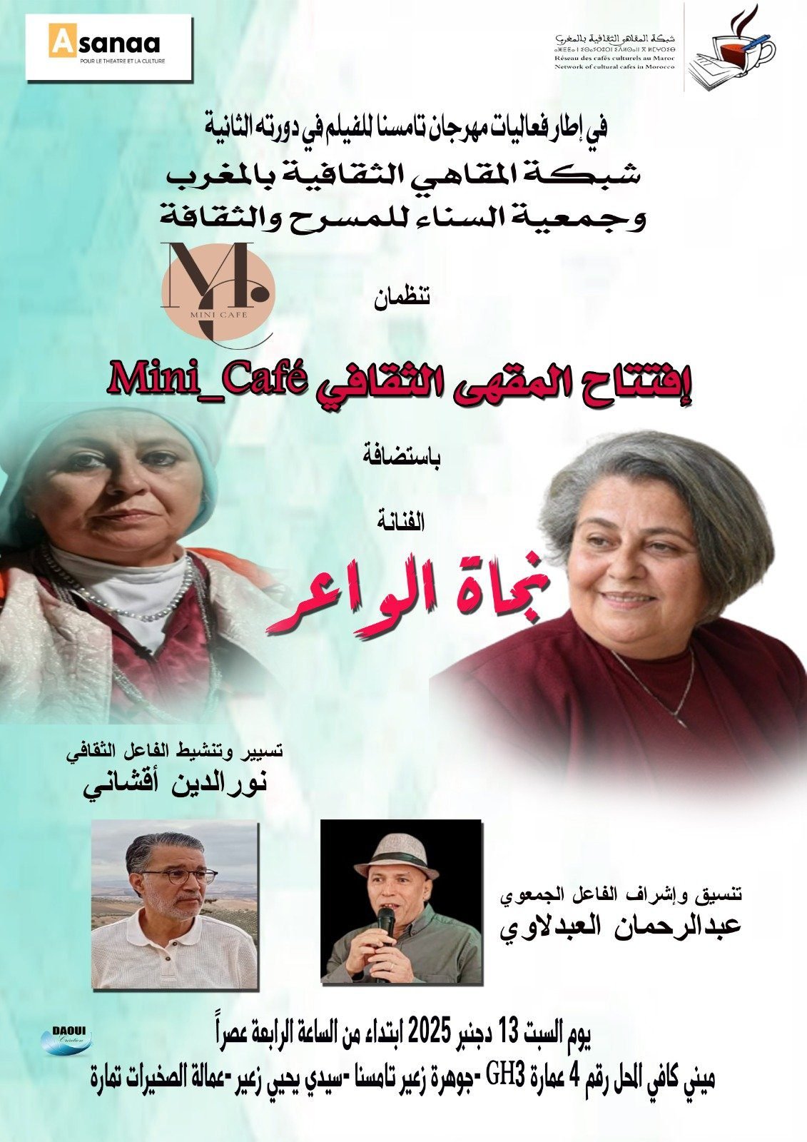 وسيتم الافتتاح يوم السبت 13 دجنبر 2025 ابتداءً من الساعة الرابعة عصراً بمقهى Mini Café الكائن بتمارة GH3 جوهرة زعير – تامسنا، بحضور الفنانة نجاة الواعر، وبتنسيق الفاعل الجمعوي عبد الرحمان العبدلاوي، وتنشيط الفاعل الثقافي نور الدين أقشاني.